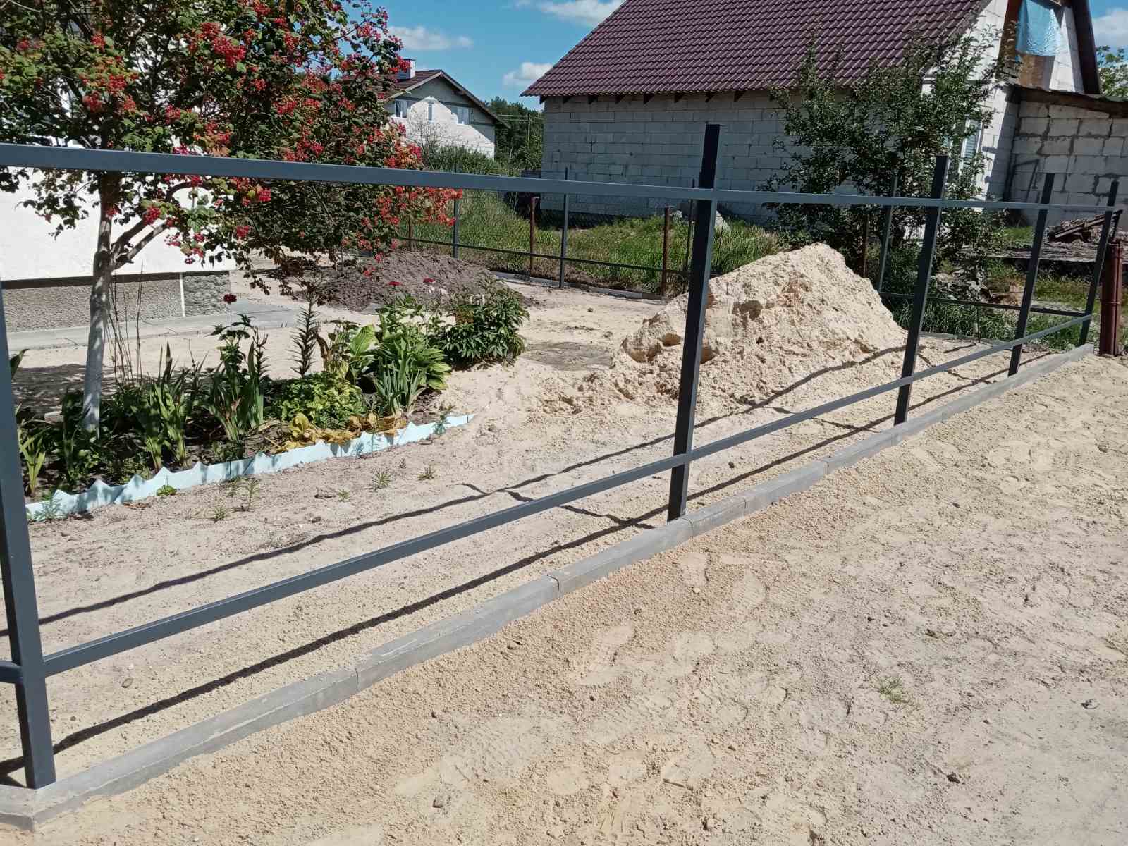 Забор из профнастила С8 в цвете RAL 7024 глянец с бордюрным камнем.